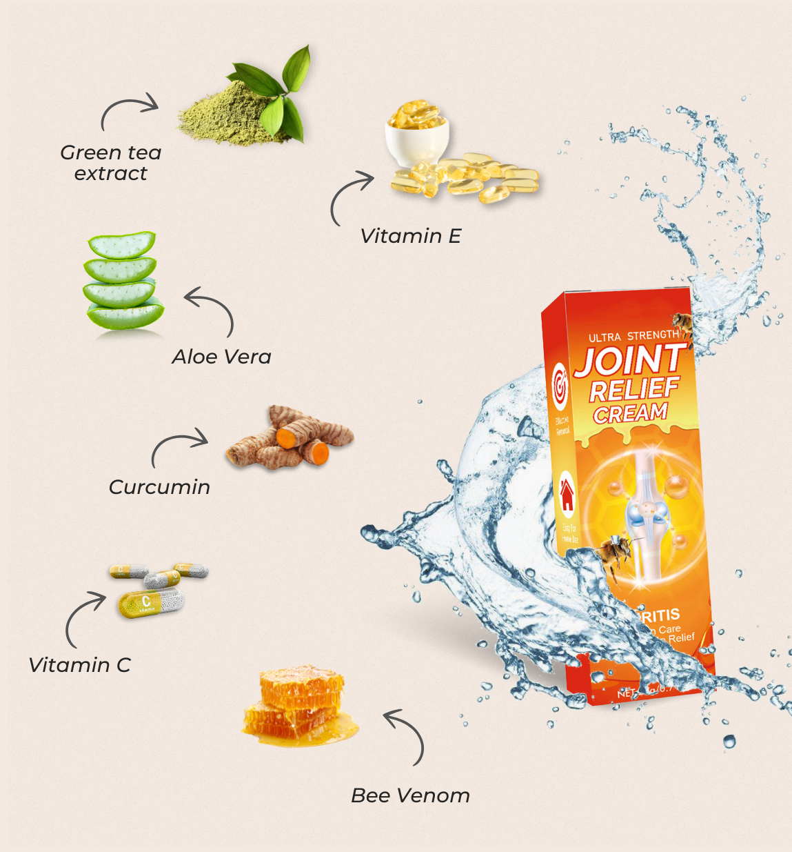 The cream contains a blend of natural ingredients, including Bee Venom, Green Tea Extract, Aloe Vera, Curcumin, Omega 3, Vitamin E, and more, all carefully chosen for their joint health benefits.